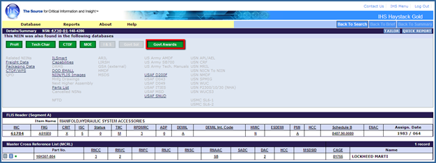 Search results for a FLIS/TIR search are displayed first in a Brief List page that lists all the possible matches for your search criteria (for example, a Part Number or NIIN). Then, when you select a specific Part Number or NIIN, Haystack displays a Detail Summary page of all the relevant information for the item.