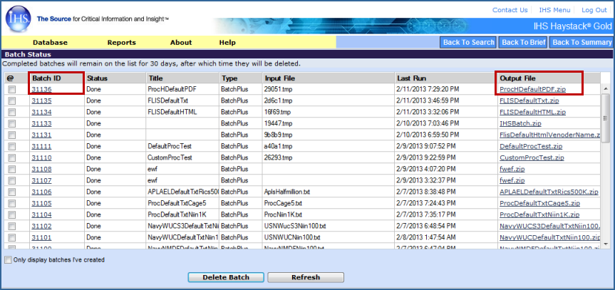 A list of all the batches you have processed is displayed on the Batch Status screen. (Click the yellow